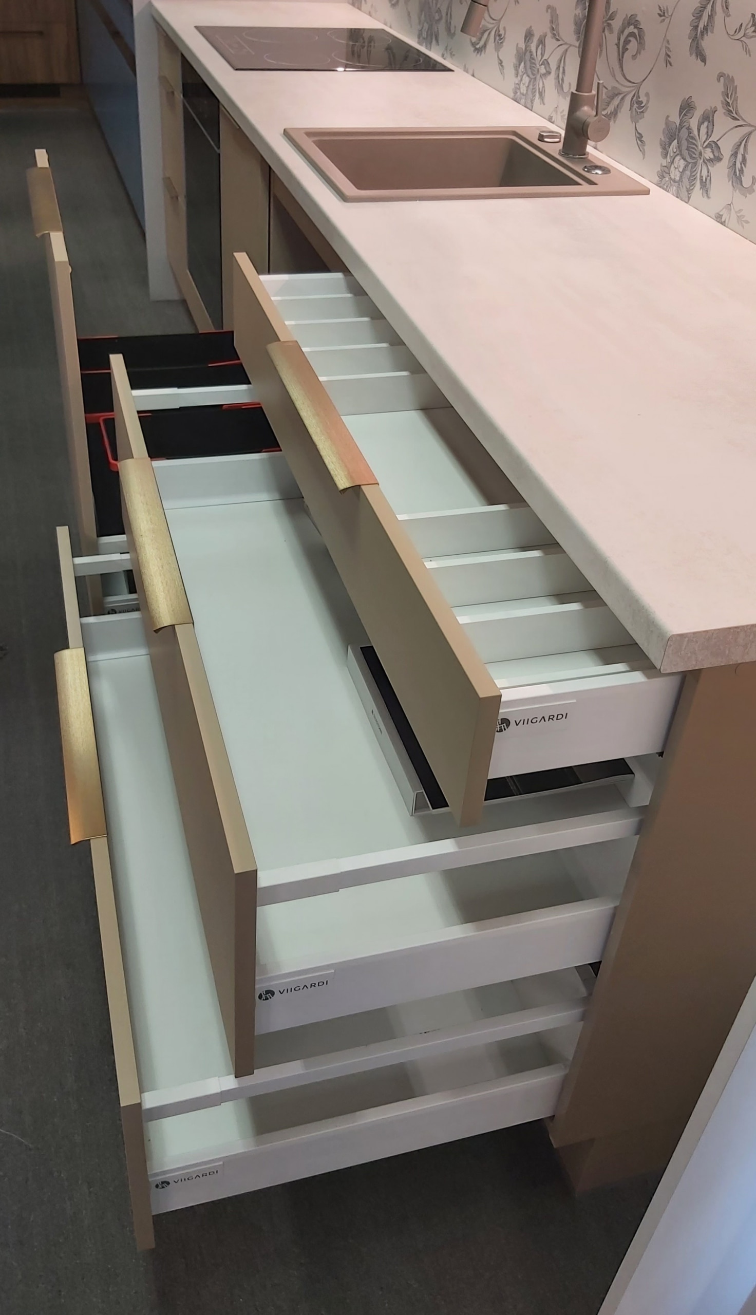 Praktiline paigutus koos Tandembox- ja Metabox-sahtlitega tagab mugava ligipääsu ja korrastatud hoiustamise. Sahtlina avanev valamukapp koos Franke prügisorteerimissüsteemiga muudab igapäevased toimetused lihtsaks ja loogiliseks. Ülemised kapid avanevad Aventos-süsteemiga, pakkudes sujuvat ja kvaliteetset kasutuskogemust.