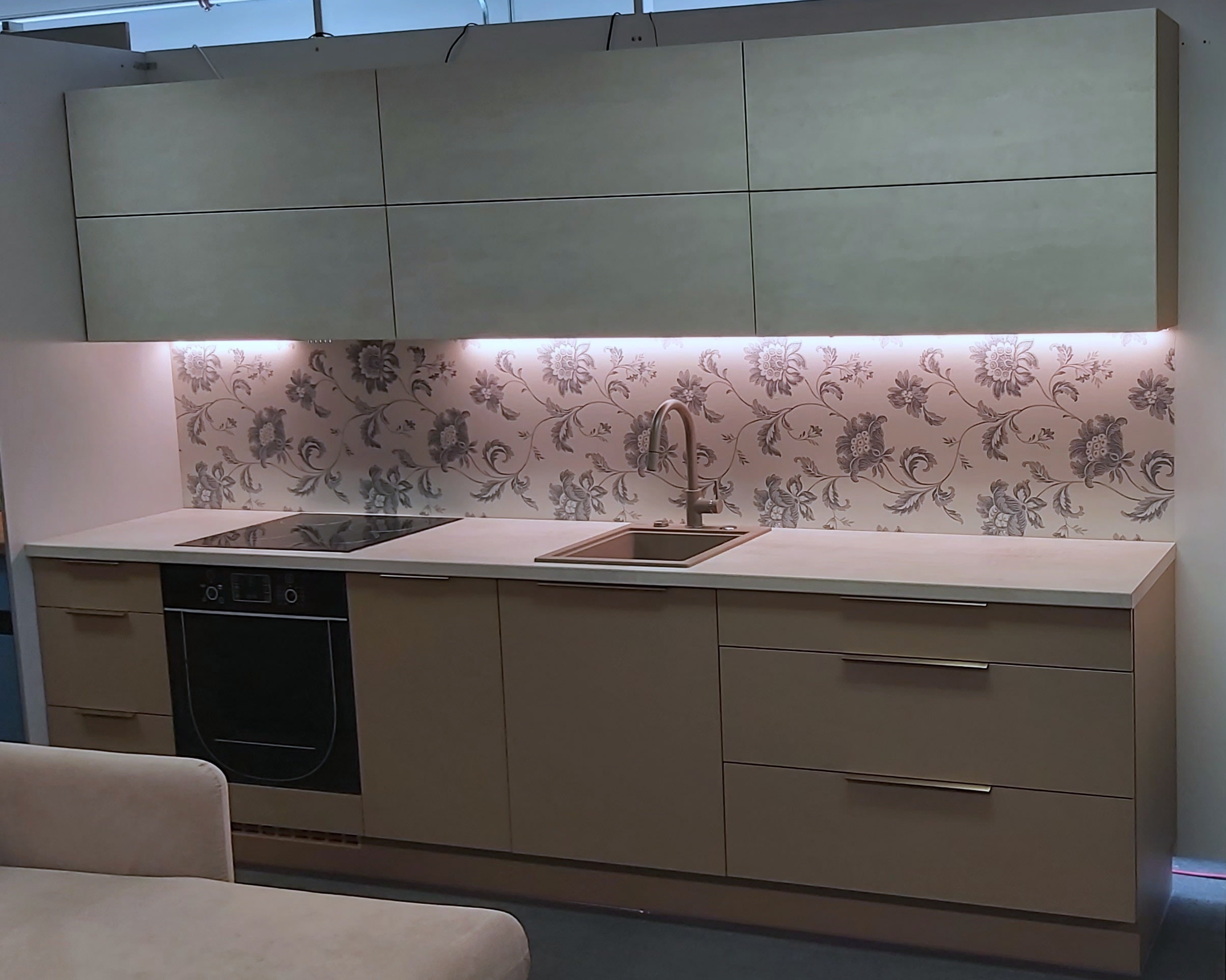 See elegantne ja rahulikes toonides köögimööbel loob pehme ning läbimõeldud terviku, mis sobib suurepäraselt nii modernse kui ka klassikalisema kodu interjööri. Ühtlase joonega kapifassaadid ja hele tööpind annavad köögile avara ning puhta ilme, mida täiendab maitsekas taust ja soe LED-valgustus.