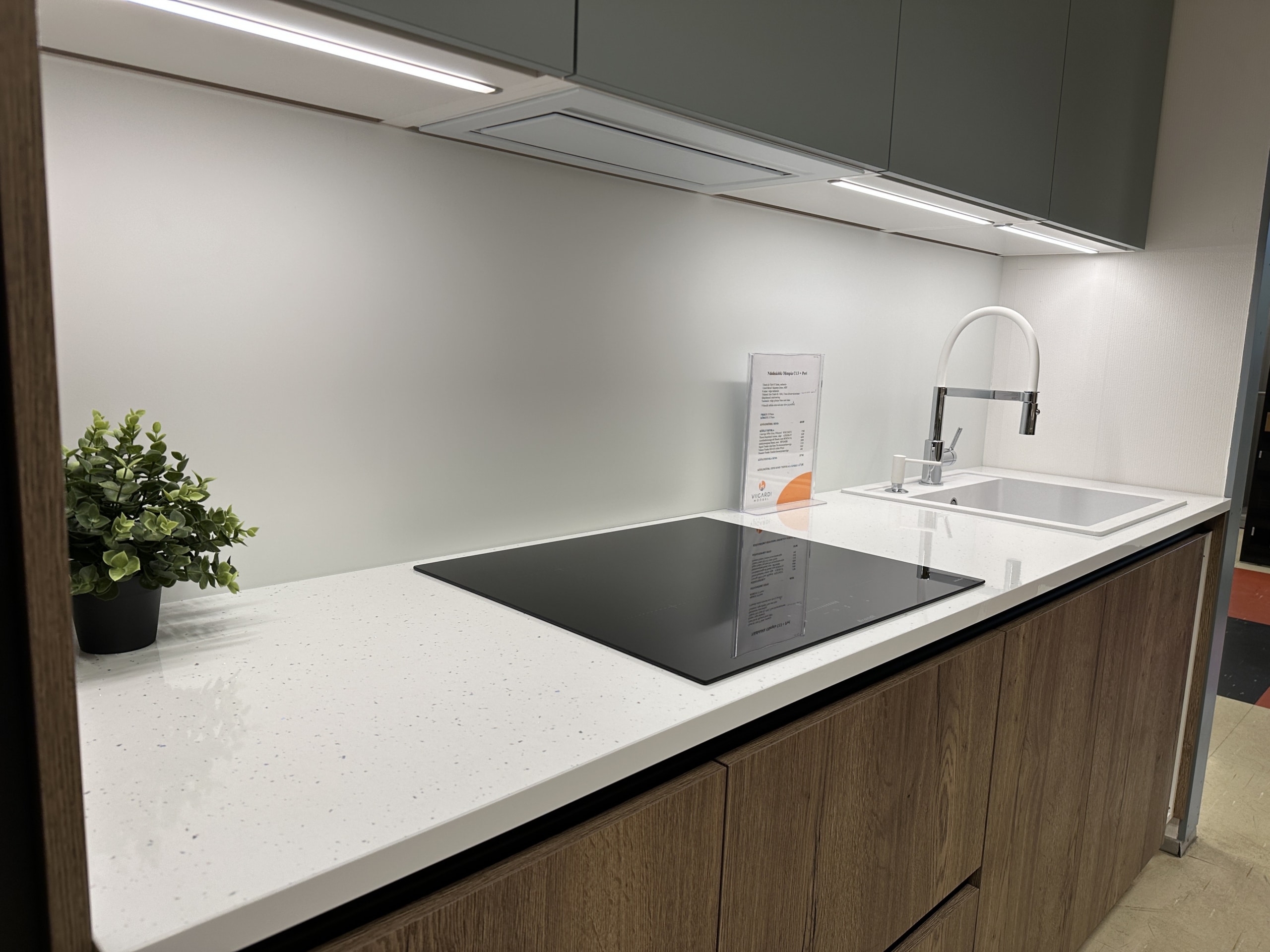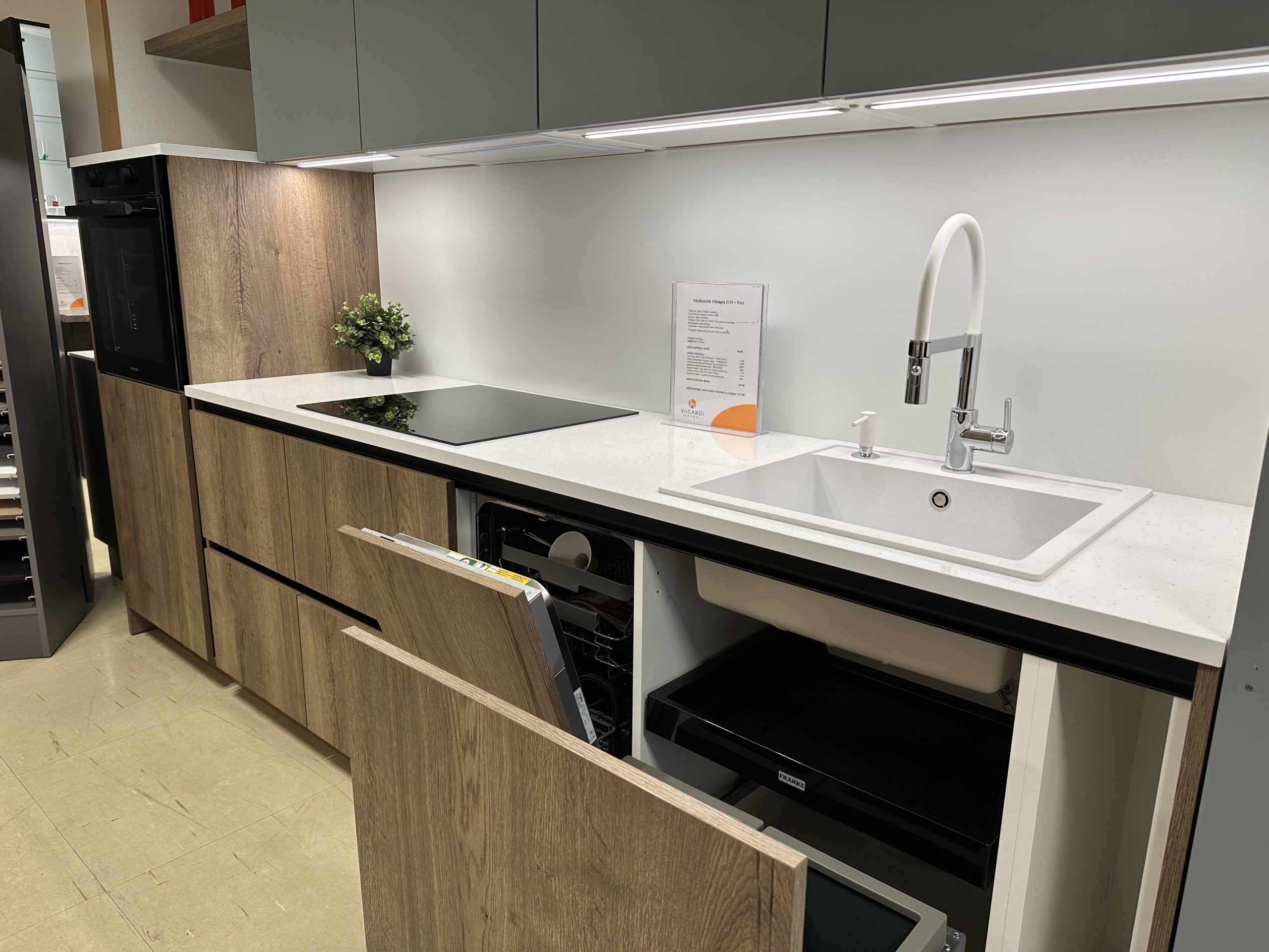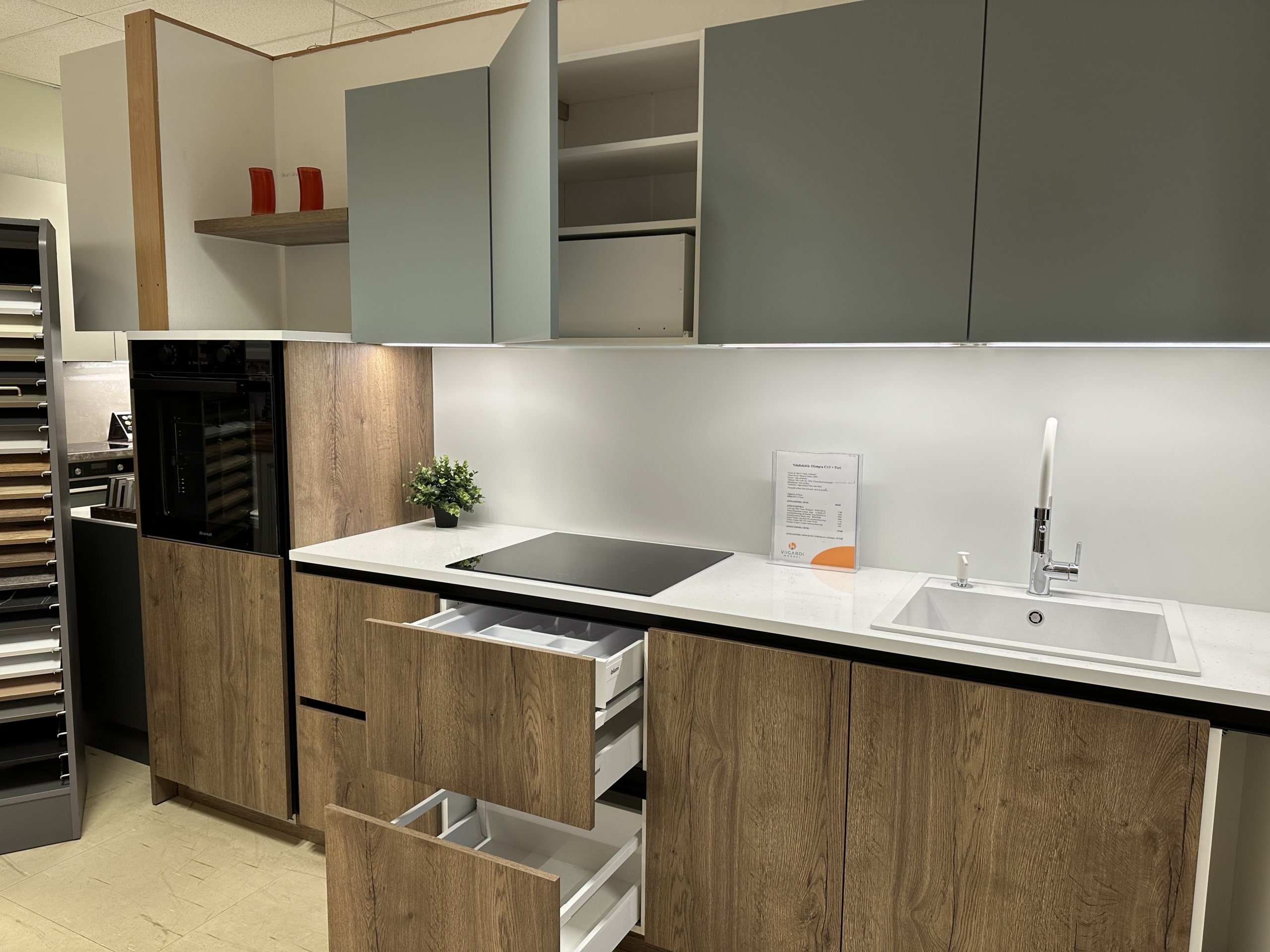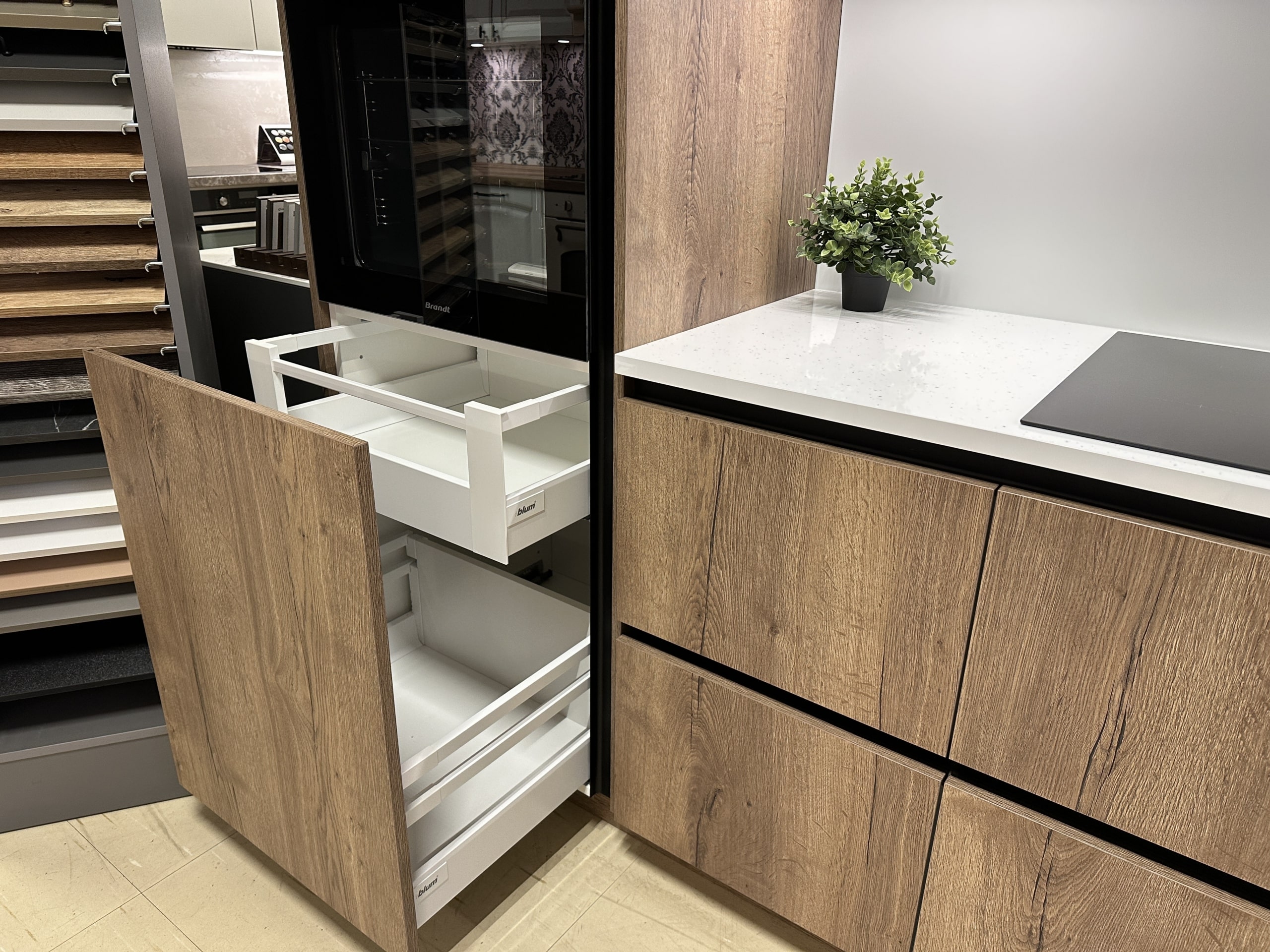 Läbimõeldud paigutus pakub rohkelt funktsionaalsust: Tandembox-sahtlid, sisesahtlid, kitsas cargo-kapp ja praktiline prügisorteri lahendus hoiavad köögi korrastatuna ka aktiivses igapäevakasutuses. Poolkõrge ahjupüstak ja peidetud õhupuhasti loovad ühtlase ning minimalistliku terviku.