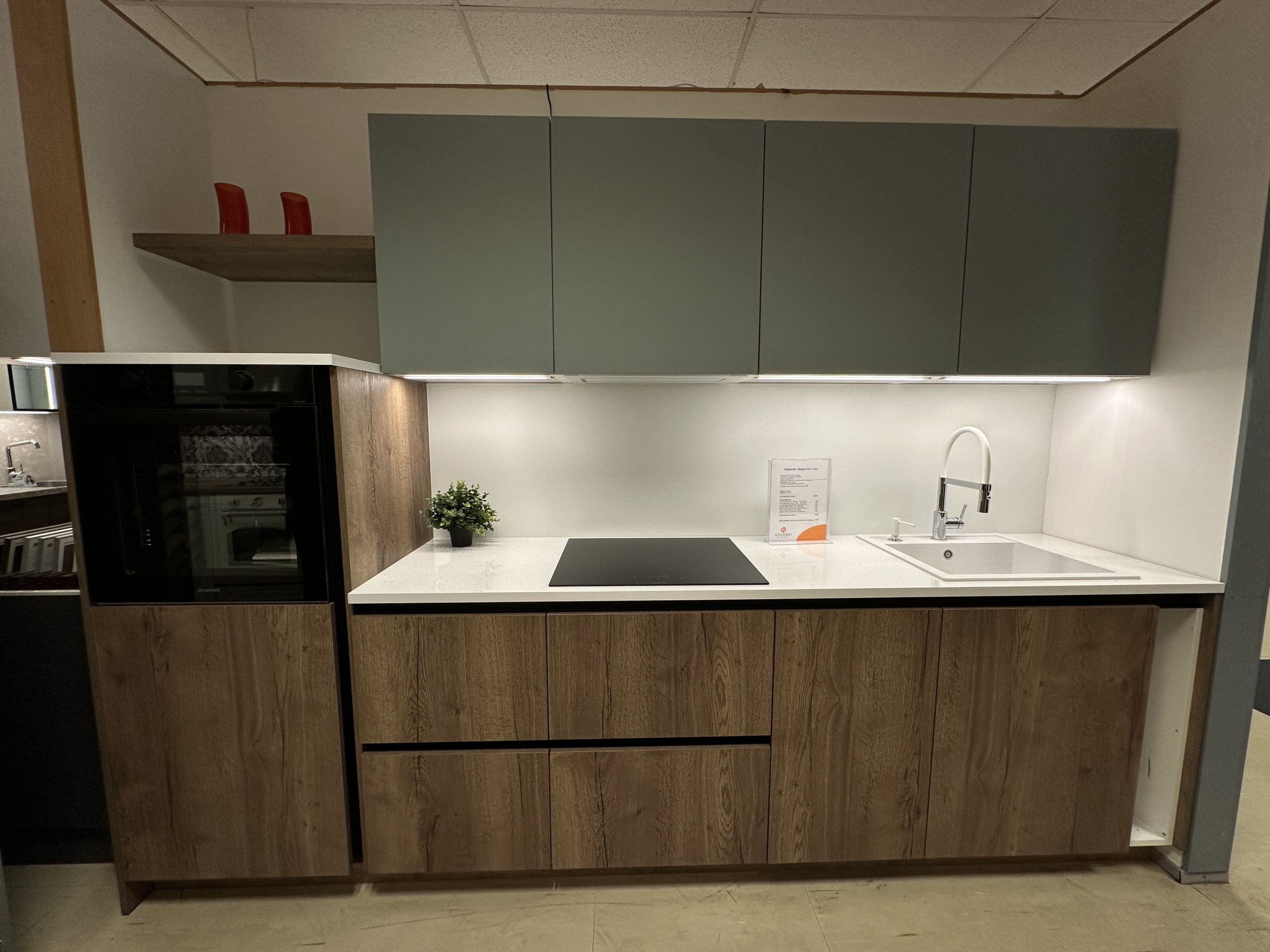See modernne ja tasakaalus köögimööbel ühendab naturaalse puidumustri, heledad pinnad ja puhta joonega disaini, luues ajatu ning rahuliku üldmulje. Valge kõrgsurvelaminaadist töötasapind koos piimja Nano matt klaasist taustaga annab köögile kerge ja valgusküllase ilme, mida täiendab diskreetne LED-valgustus.