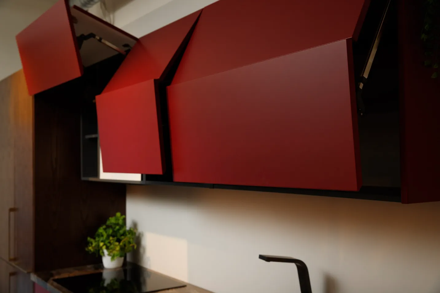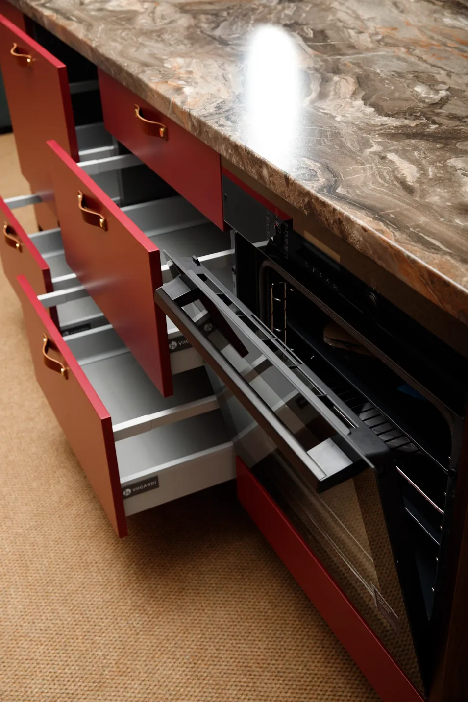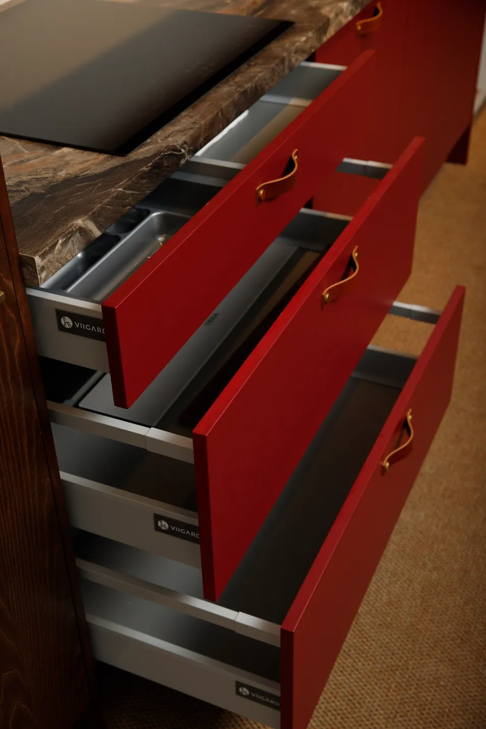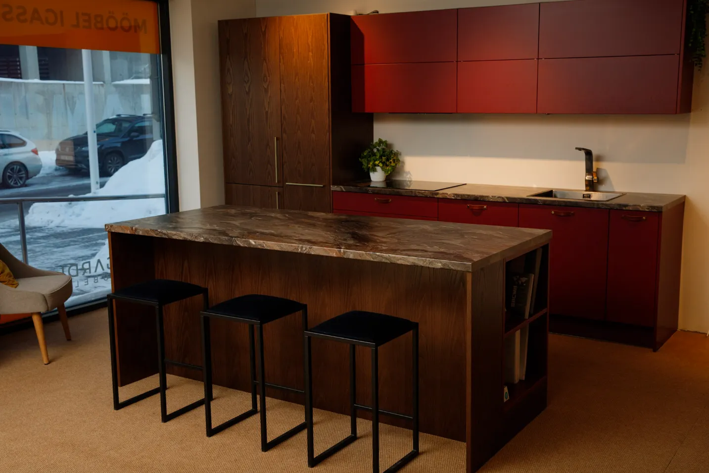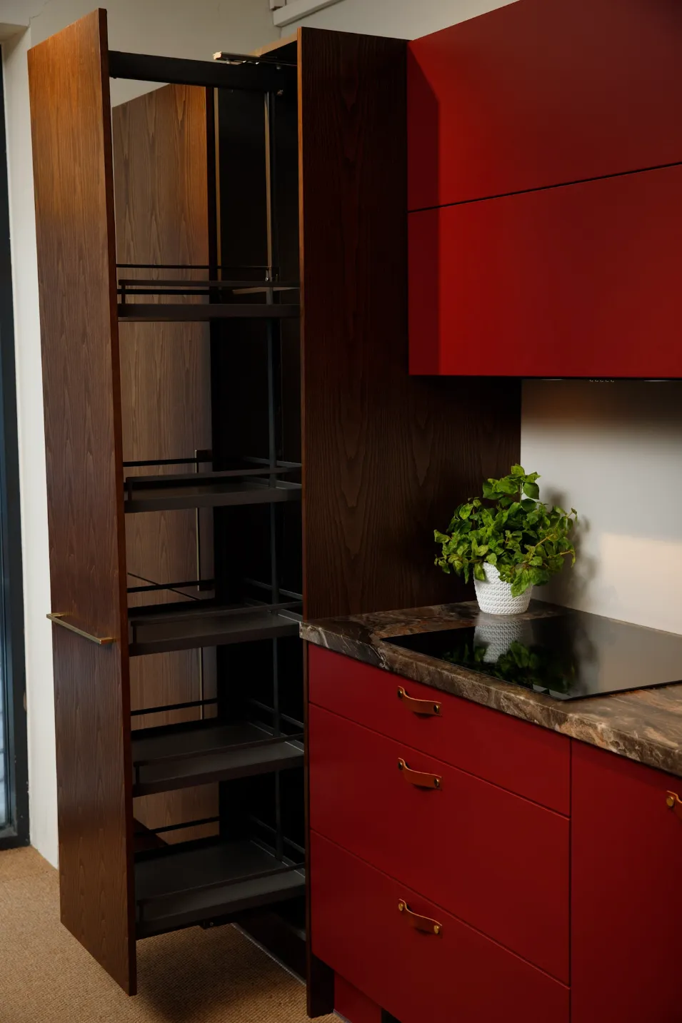 See silmapaistev ja väga mahukas köök on loodud neile, kes soovivad, et köök oleks kodu keskpunkt – koht, kus kohtuvad funktsionaalsus, julgus ja disain. Sügavpunased värvitud MDF-fassaadid koos naturaalse spooniga loovad tugeva ja iseloomuga üldmulje, mida täiendab elegantne töötasapind ja suur köögisaar.