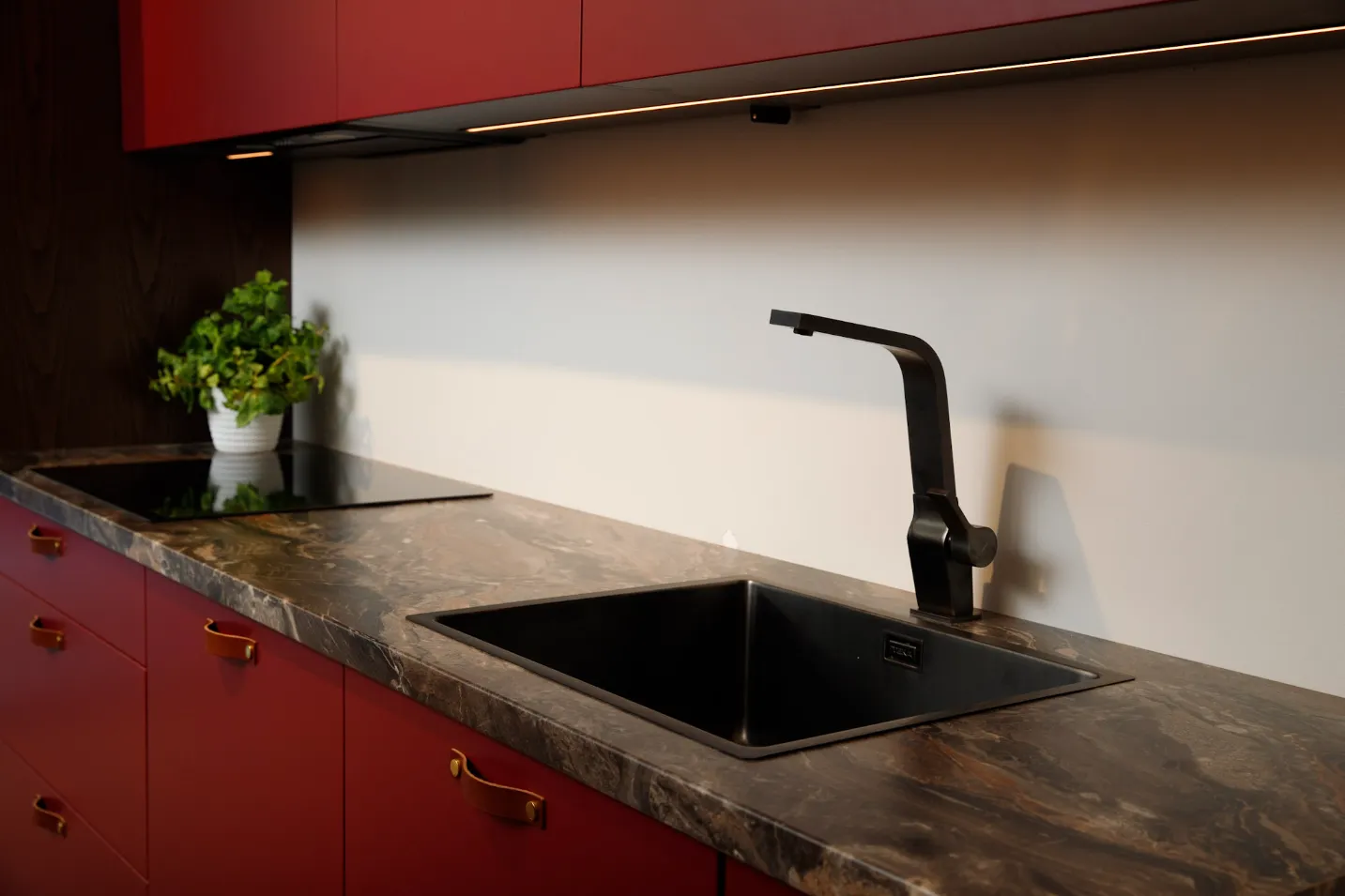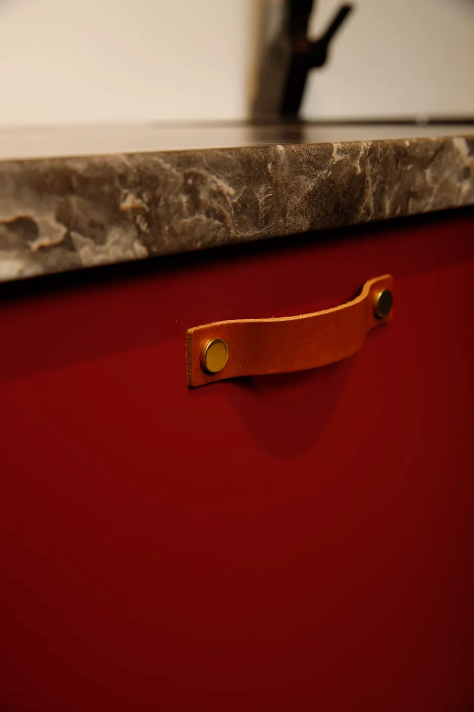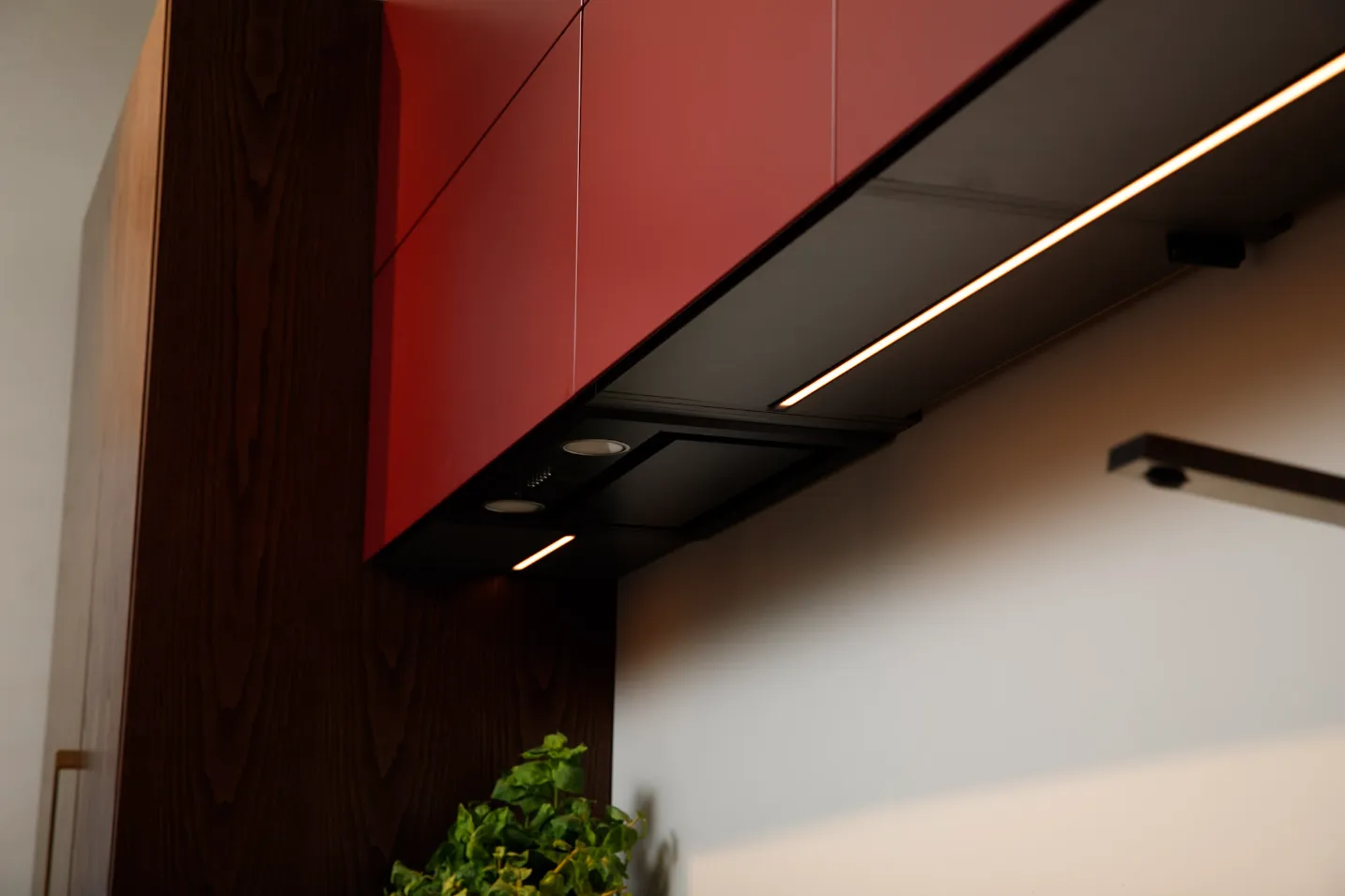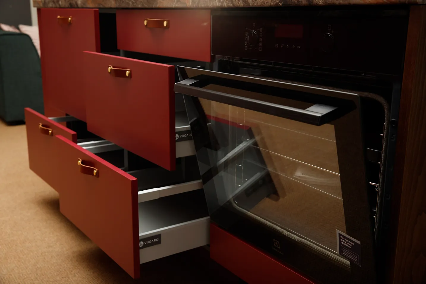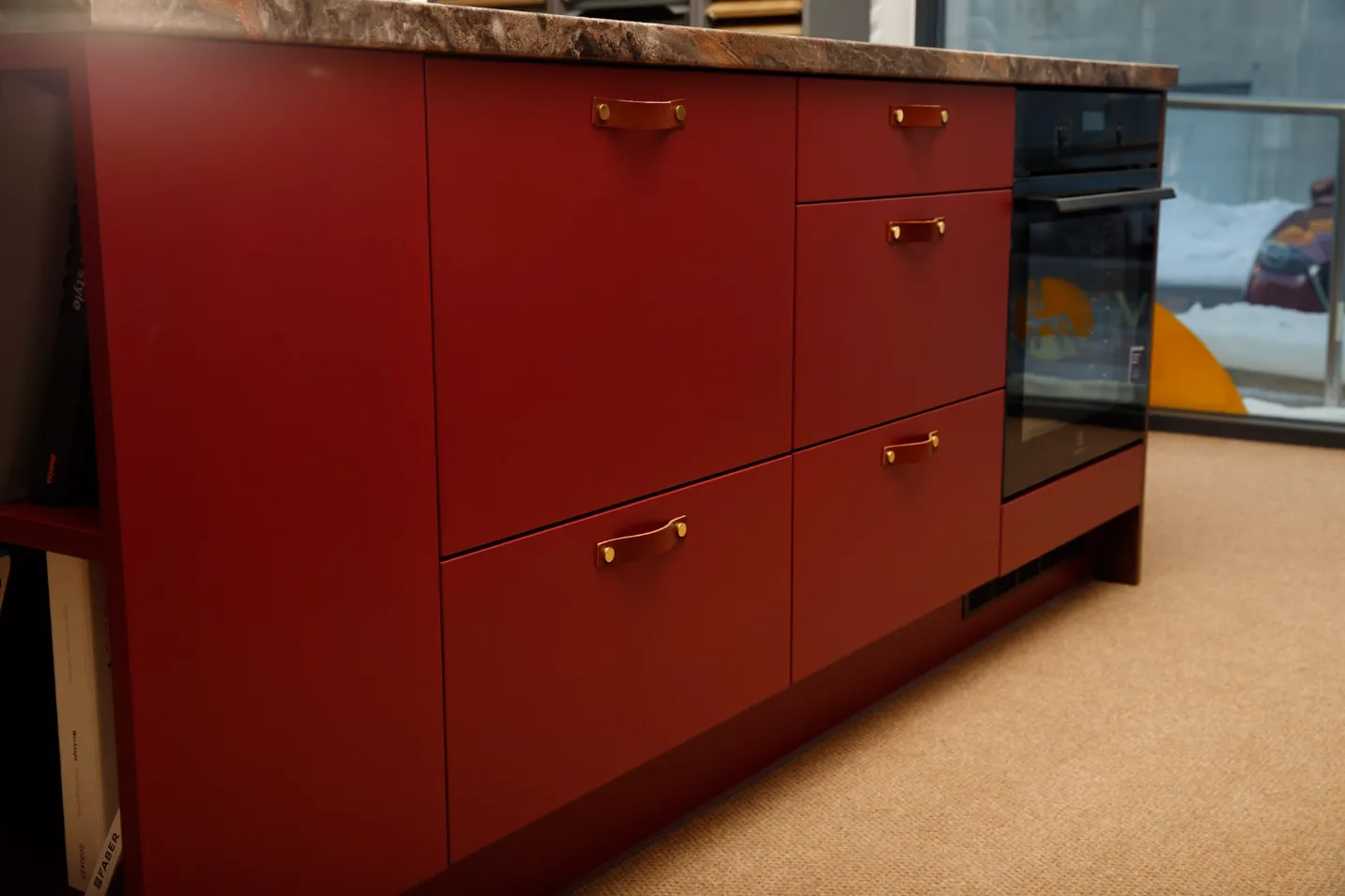 See silmapaistev ja väga mahukas köök on loodud neile, kes soovivad, et köök oleks kodu keskpunkt – koht, kus kohtuvad funktsionaalsus, julgus ja disain. Sügavpunased värvitud MDF-fassaadid koos naturaalse spooniga loovad tugeva ja iseloomuga üldmulje, mida täiendab elegantne töötasapind ja suur köögisaar.