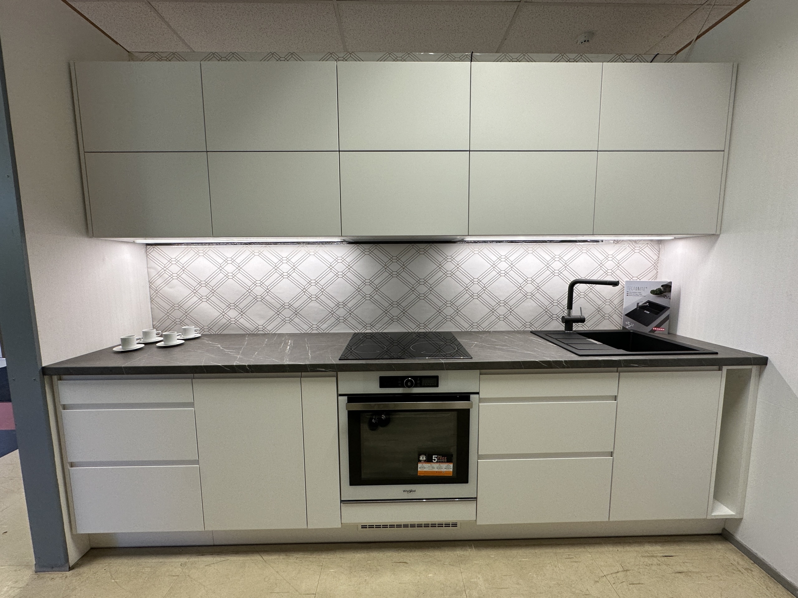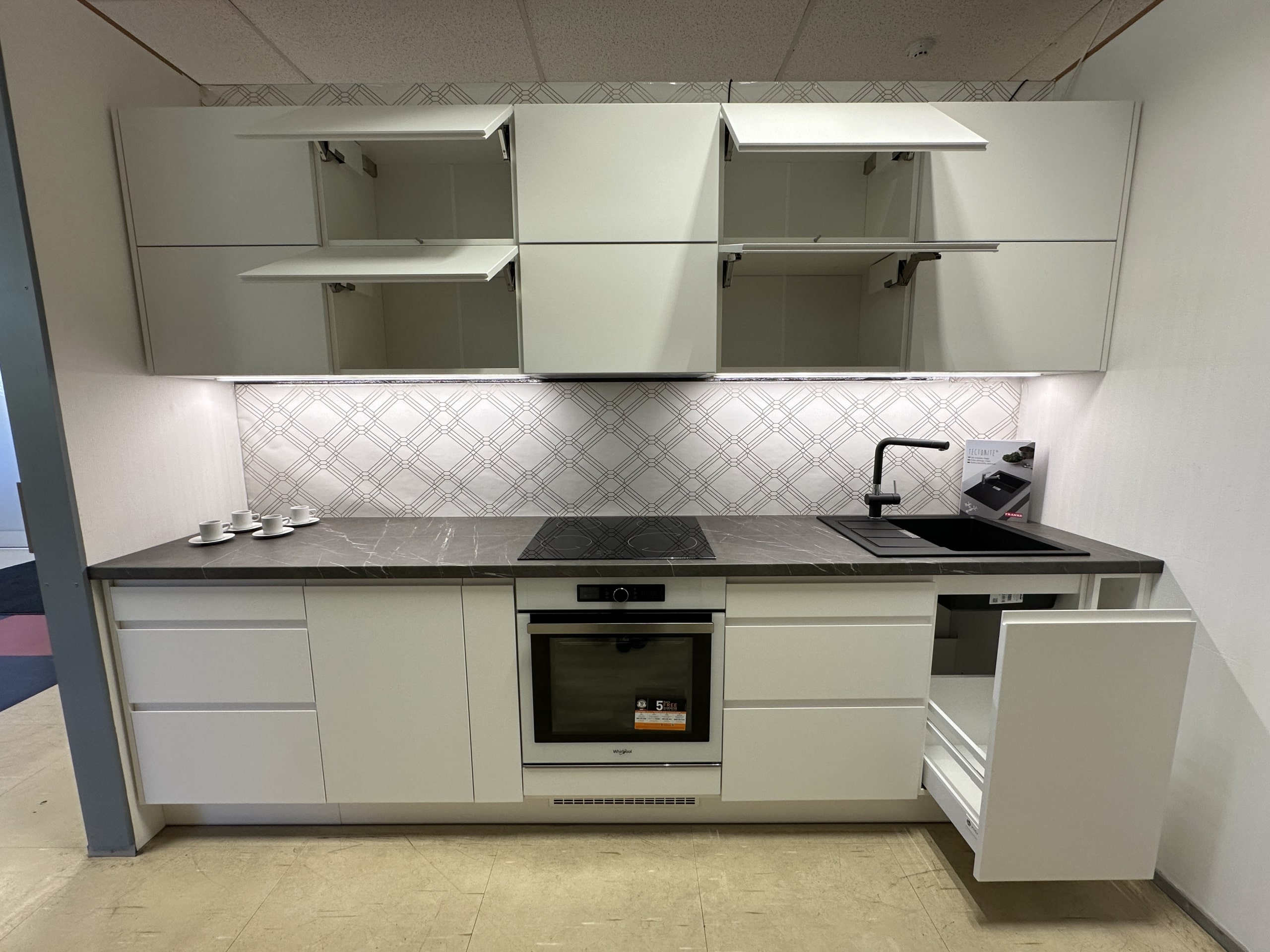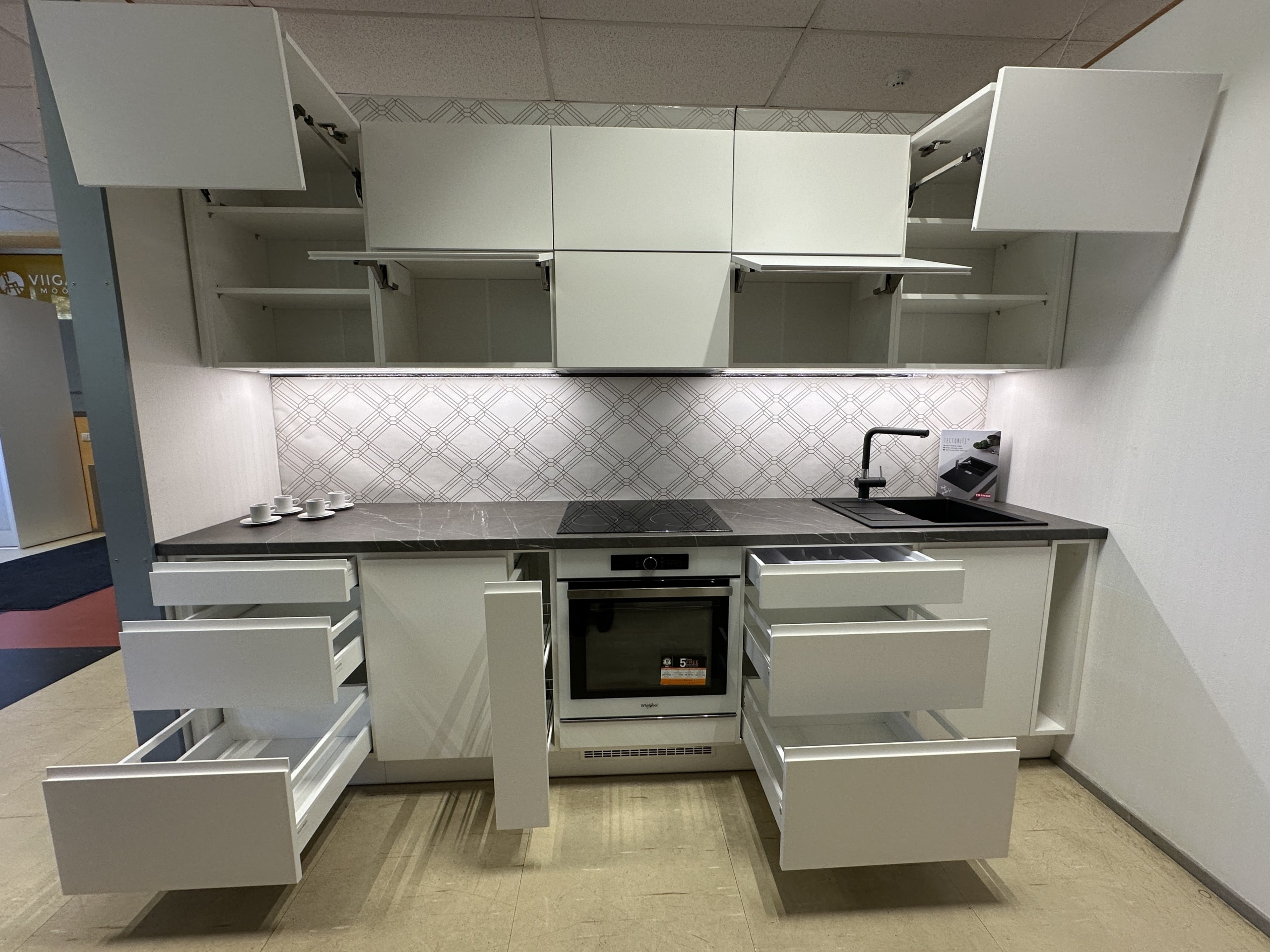 See modernne köögikomplekt ühendab ajatu valge disaini, käepidemeteta puhta joone ja praktilise lahenduse igapäevaseks kasutamiseks. Nutikas sahtlite ja kappide jaotus pakub rohkelt panipaika, samas kui üles avanevad uksed ja kvaliteetsed Aventos tõstemehhanismid tagavad mugavuse ka kompaktsemas ruumis. Integreeritud LED-riba loob tööpinnale selge ja hubase valgustuse.